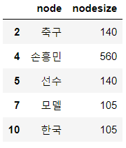 # 키워드와 키워드 빈도 점수를 ‘node’, ‘nodesize’ 라는 데이터 프레임의 피처로 생성