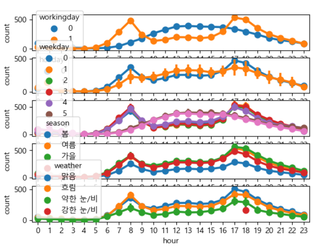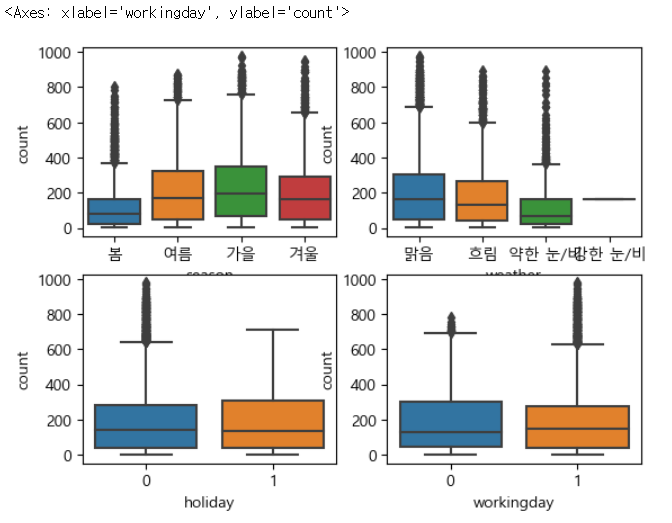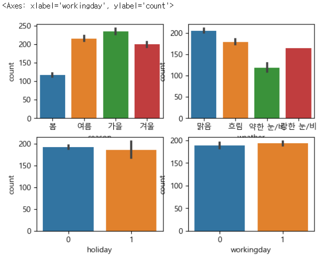 - workingday - whether the day is neither a weekend nor holiday *0: 주말 및 국경일 / 1: 근무날