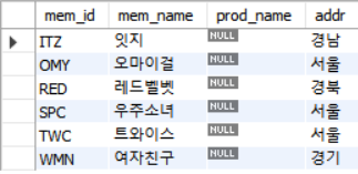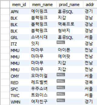 - RIGHT OUTER JOIN: 반대. 오른쪽에 있는 회원테이블을 기준으로 외부조인.